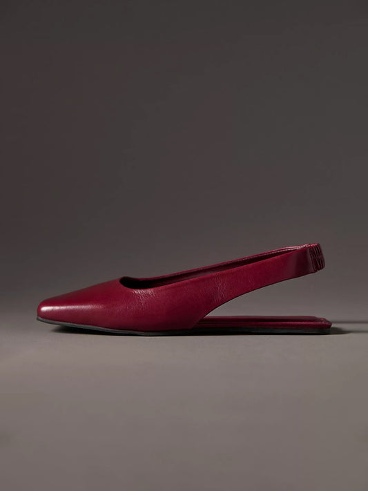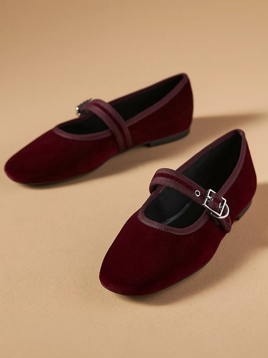Wine Red Velvet Square-Toe Classic Bridge Strap Ballet Flats