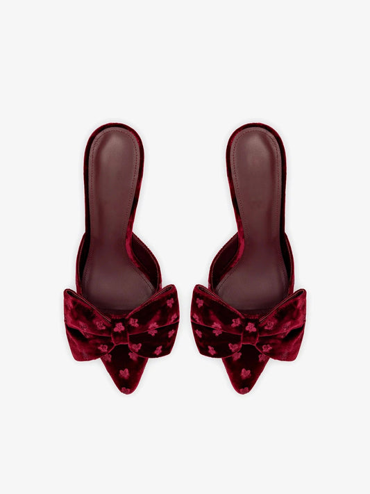 Wine Red Velvet Pointed-Toe Flowers Embroidery Big Front Bow High Heels
