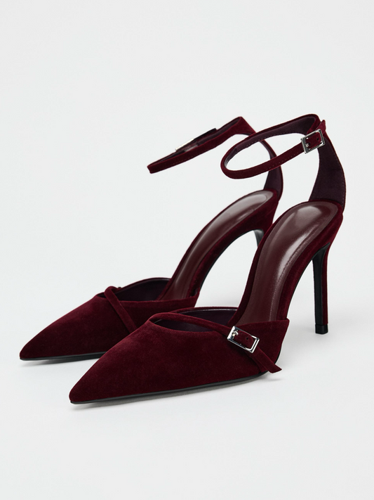 Wine Red Velvet Pointed-Toe Front Strap Pump High Heels With Buckled Ankle Strap