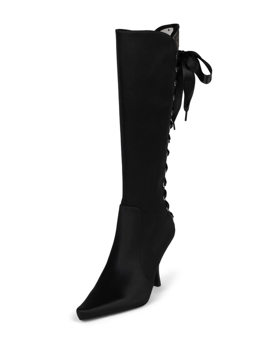 Black Satin Fabric Pointed-Toe Full-Zip Mid Calf Stiletto Boots With Lace-Up