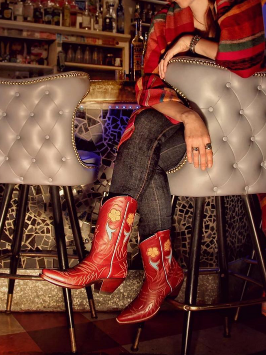 Red Embroidery Yellow Flower Inlay Snip-Toe Ankle Cowgirl Boots