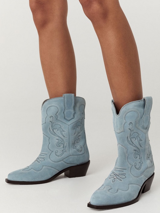 Powder Blue Faux Suede Almond-Toe Embroidery Cowgirl Ankle Boots