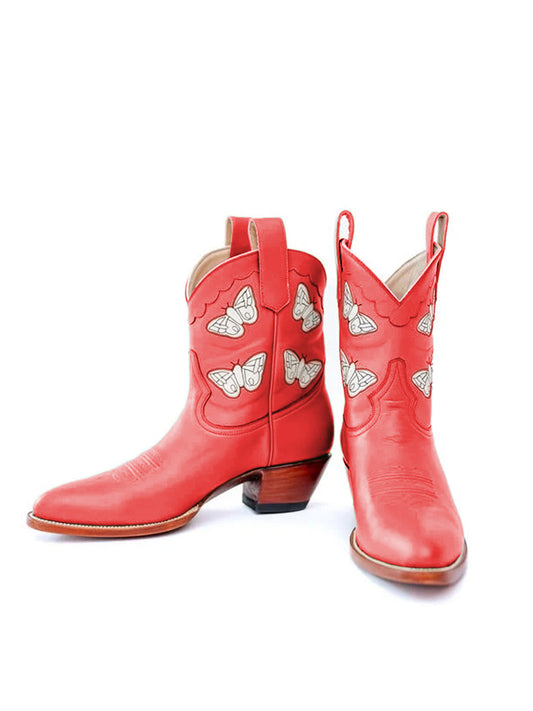 Red Almond-Toe Butterfly Inlay Ankle Cowgirl Boots
