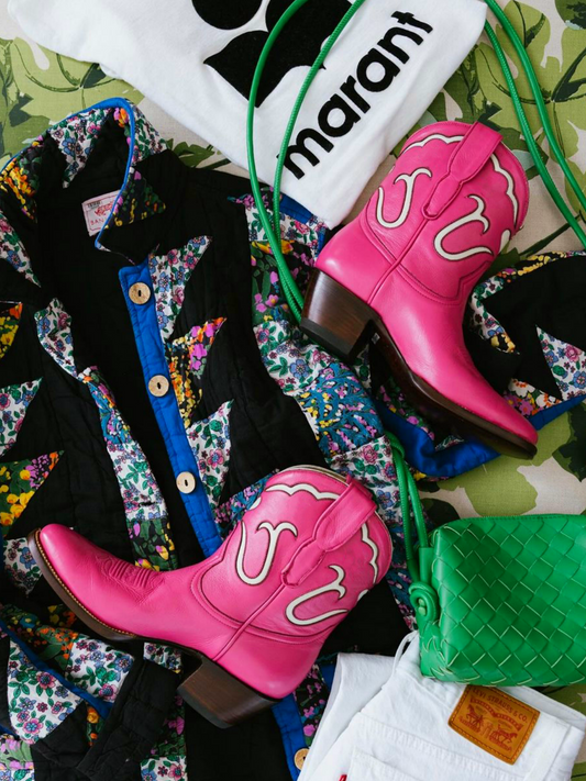 White Heart Inlay Almond-Toe Ankle Cowgirl Boots - Pink