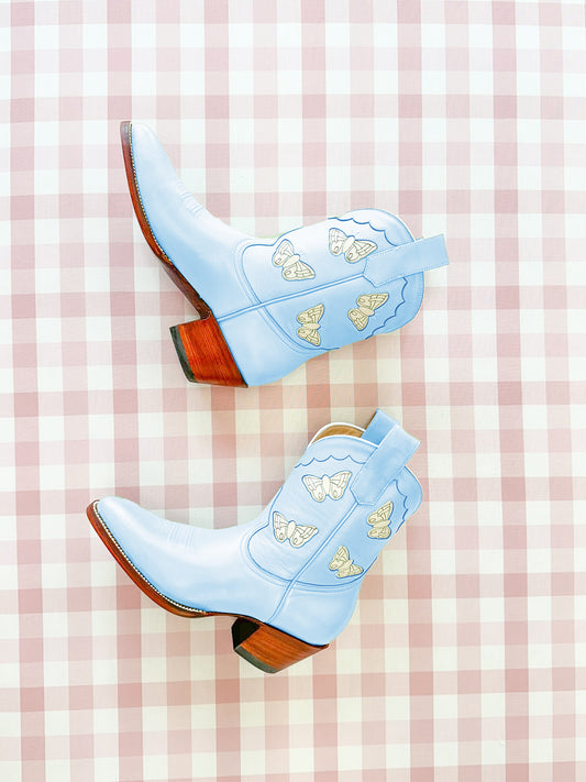 Blue Almond-Toe Butterfly Inlay Ankle Cowgirl Boots