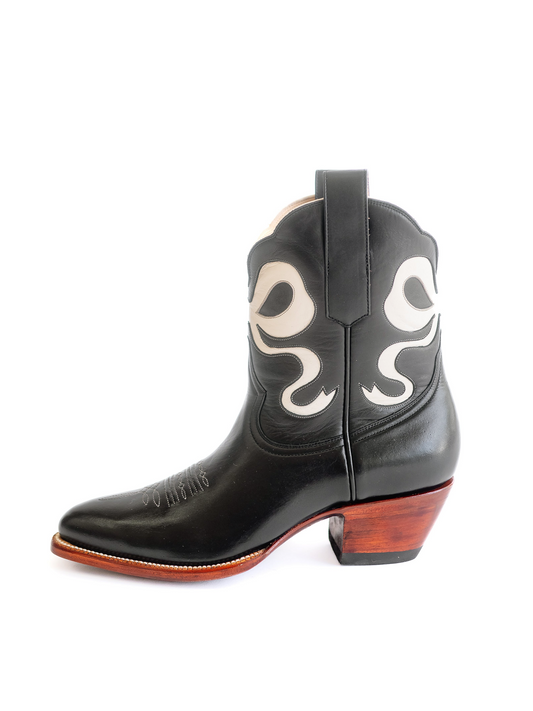 Black Almond-Toe Cowgirl Ankle Boots With White Bowknot Inlay