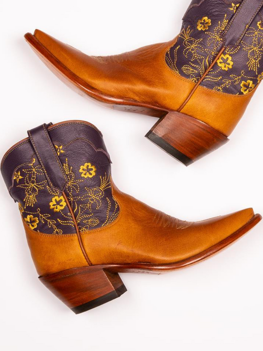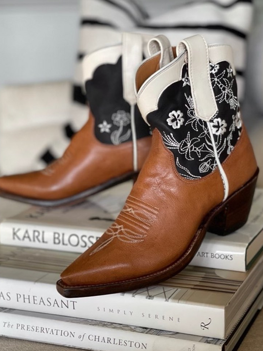 Contrast Tawny And Black Snip-Toe Cowgirl Ankle Booties With Floral Embroidery