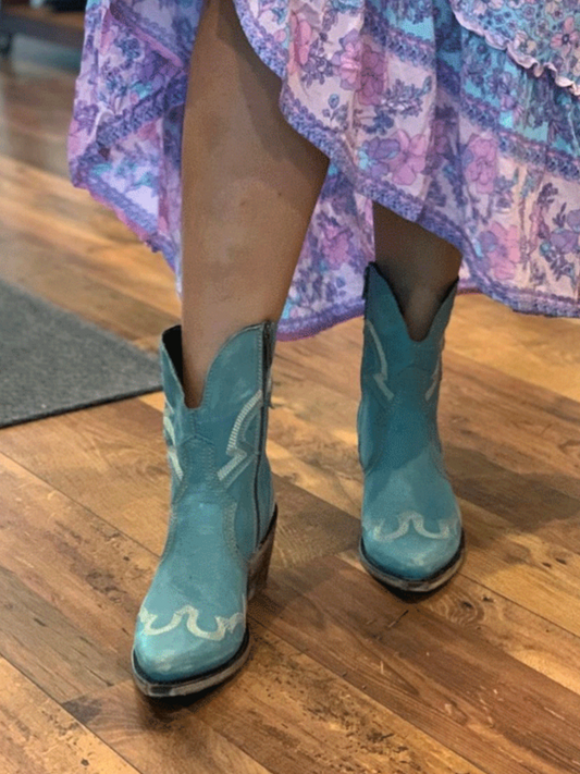 Turquoise Round Pointed-Toe Embroidery Full-Zip Ankle Booties