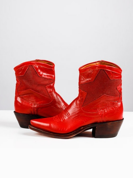 Red Snip-Toe Cowgirl Ankle Booties With Dark Red Big Star Inlay