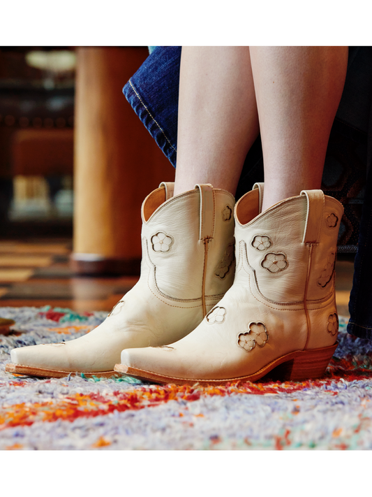 Cream Vegan Leather Snip-Toe Cowgirl Ankle Booties With Flower Inlay