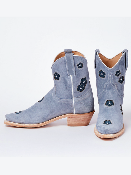 Blue Faux Suede Snip-Toe Cowgirl Ankle Booties With Black Flower Inlay