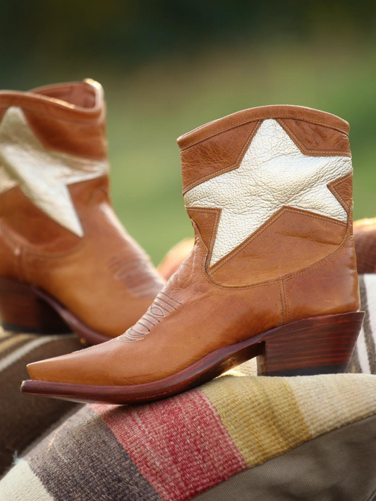 Brown Snip-Toe Cowgirl Ankle Booties With Metallic Gold Big Star Inlay