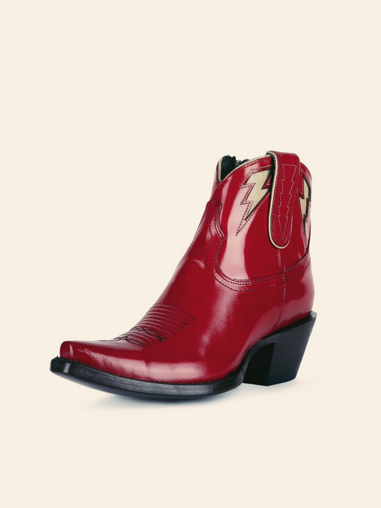 Lightning Inlay Snip-Toe Full-Zip Ankle Booties - Red Patent