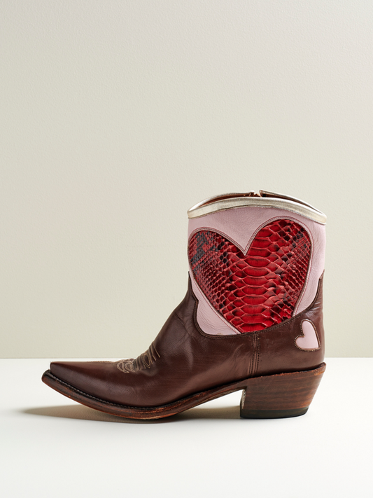 Contrast Brown And Pink Snip-Toe Metallic Snakeskin Red Heart Inlay Ankle Booties