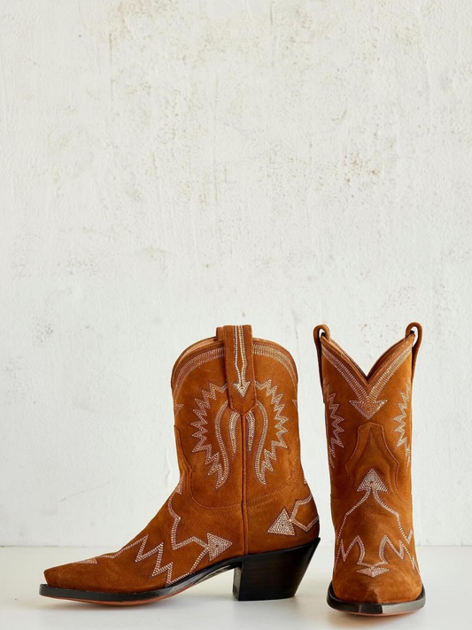 Jagged Embroidery Snip-Toe Ankle Cowgirl Boots - Brown Faux Suede