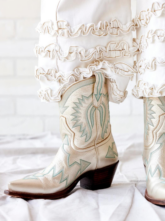 Metallic Embroidery Snip-Toe Ankle Cowgirl Boots - Light Champagne