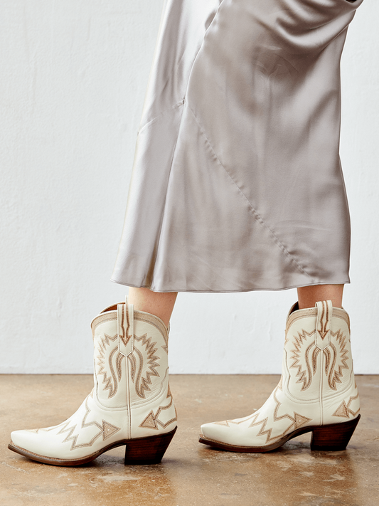 Jagged Embroidery Snip-Toe Cowgirl Ankle Boots - Cream
