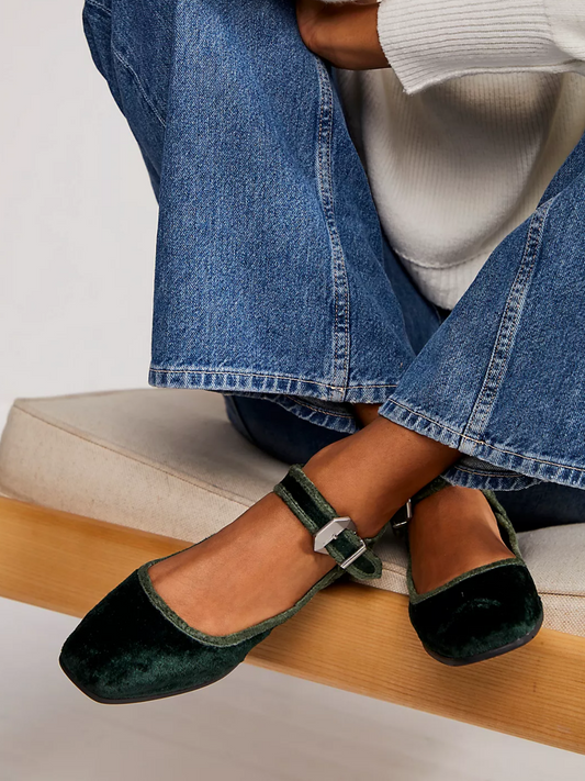 Dark Green Velvet Square-Toe Ankle Strap Mary Janes Flats