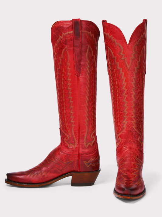 Crinkle Snip-Toe Embroidery Wide Calf Knee High Tall Cowgirl Boots - Red