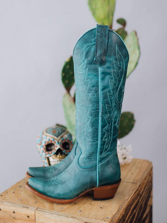 Distressed Turquoise Eagle Embroidery Snip-Toe Half-Zip Cowgirl Knee High Tall Boots