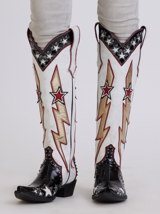 Contrast Black Patent And White Studded Star Lightning Wide Calf Knee High Tall Cowgirl Boots