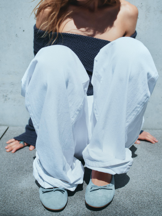 Blue Faux Suede Round-Toe Bow Ballet Flats