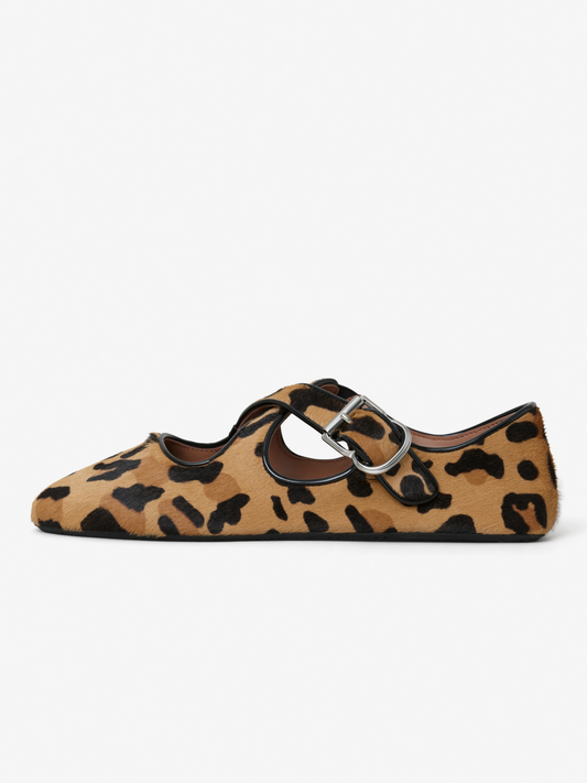 Brown Faux Leopard-Print Pony Hair Round-Toe Cross Buckle Straps Ballet Flats