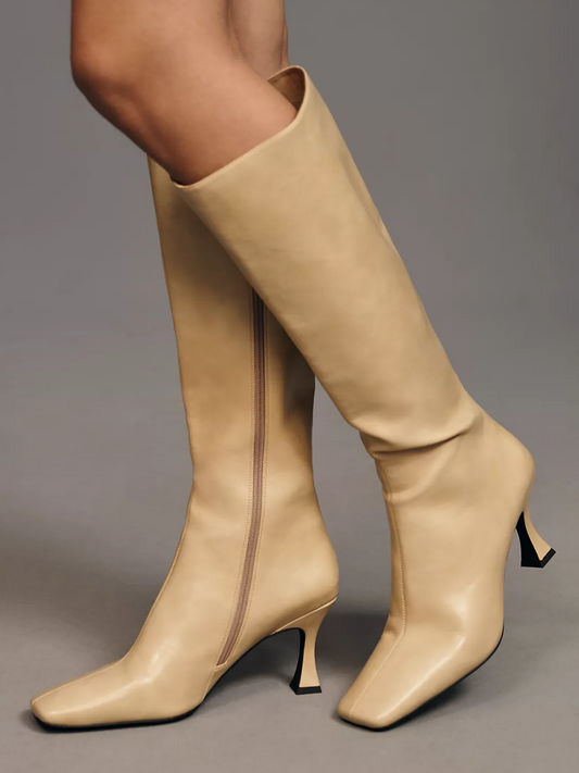 Square-Toe Knee High Full-Zip Stiletto Boots - Light Yellow
