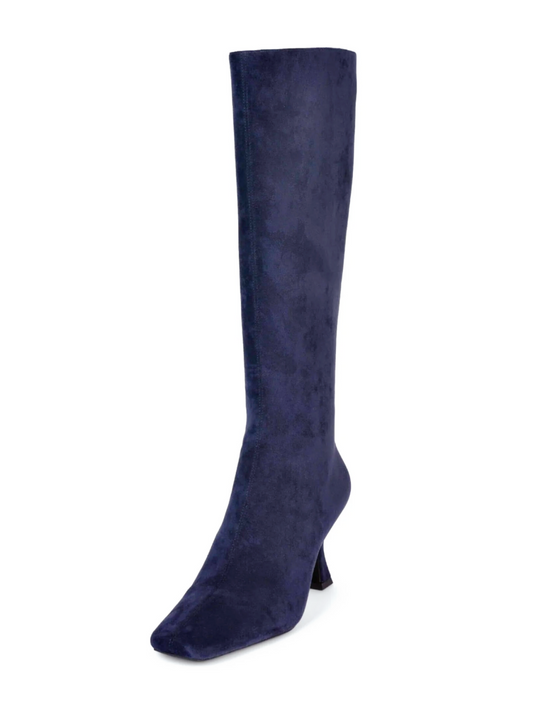 Square-Toe Full-Zip Mid Calf Stiletto Boots - Blue Faux Suede