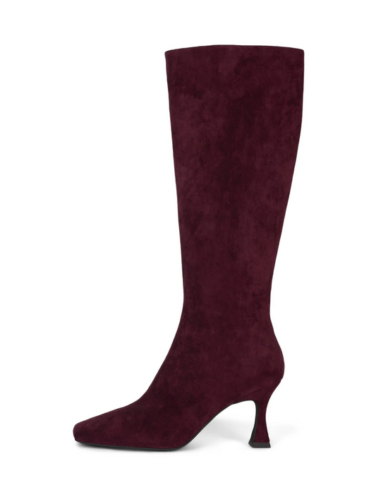 Square-Toe Full-Zip Mid Calf Stiletto Boots - Wine Red Faux Suede