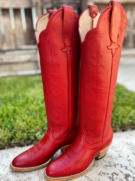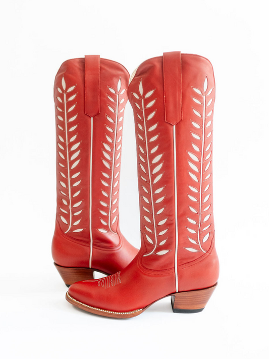 Almond-Toe Ivory Leaves Inlay Wide Calf Tall Knee High Cowgirl Boots - Red