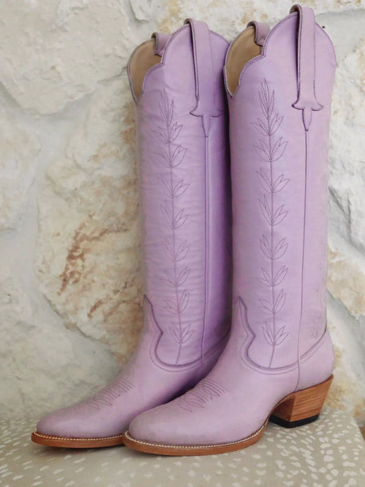 Almond-Toe Leaves Embroidery Wide Calf Knee High Cowgirl Boots - Lavender