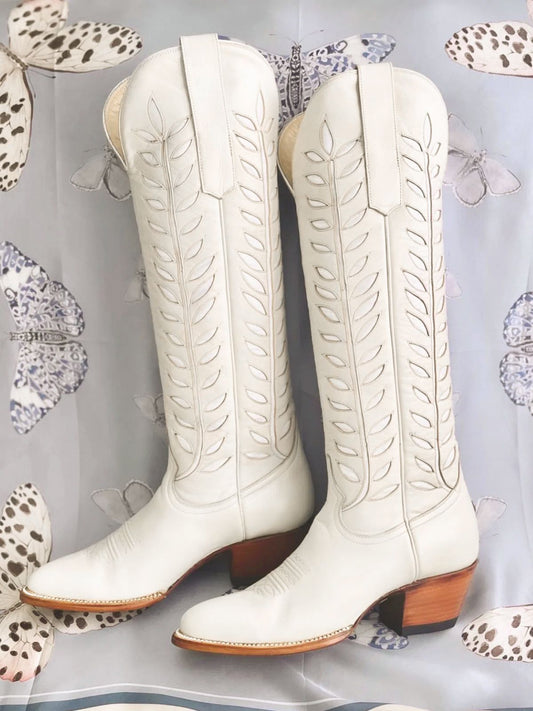 Almond-Toe Ivory Leaves Inlay Wide Calf Tall Knee High Cowgirl Boots - Cream