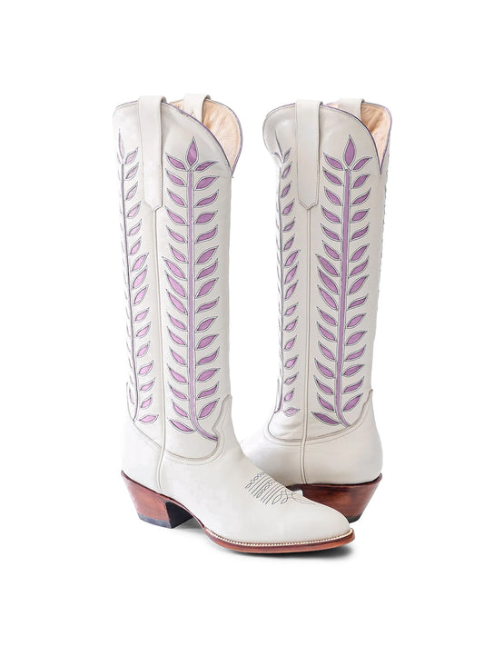 Almond-Toe Lavender Leaves Inlay Wide Calf Tall Knee High Cowgirl Boots - White