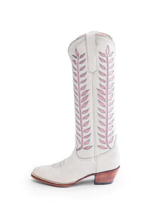 Almond-Toe Pink Leaves Inlay Wide Calf Tall Knee High Cowgirl Boots - White