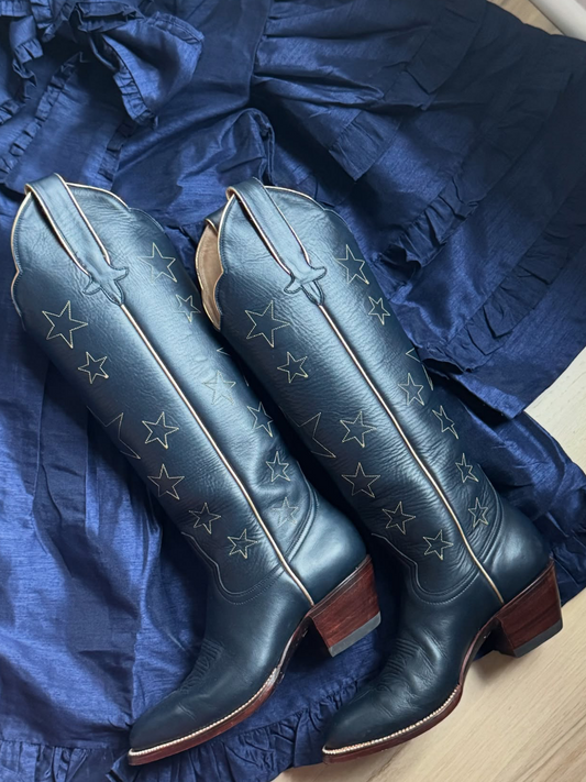 Almond-Toe Stars Embroidery Wide Calf Knee High Cowgirl Boots - Navy Blue