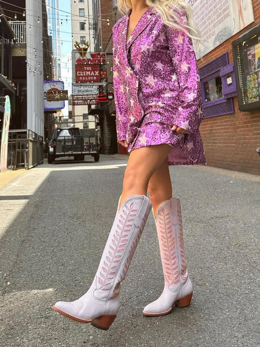 Almond-Toe Pink Leaves Inlay Wide Calf Tall Knee High Cowgirl Boots - Lavender