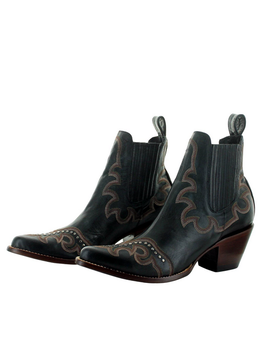 Almond-Toe Studded Embroidery Ankle Cowgirl Boots - Black