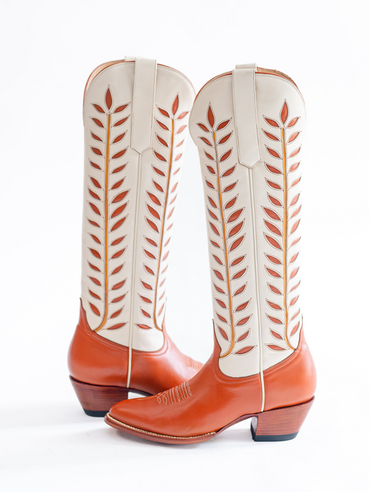 Almond-Toe Leaves Inlay Wide Calf Tall Knee High Cowgirl Boots - Contrast Orange And Ivory
