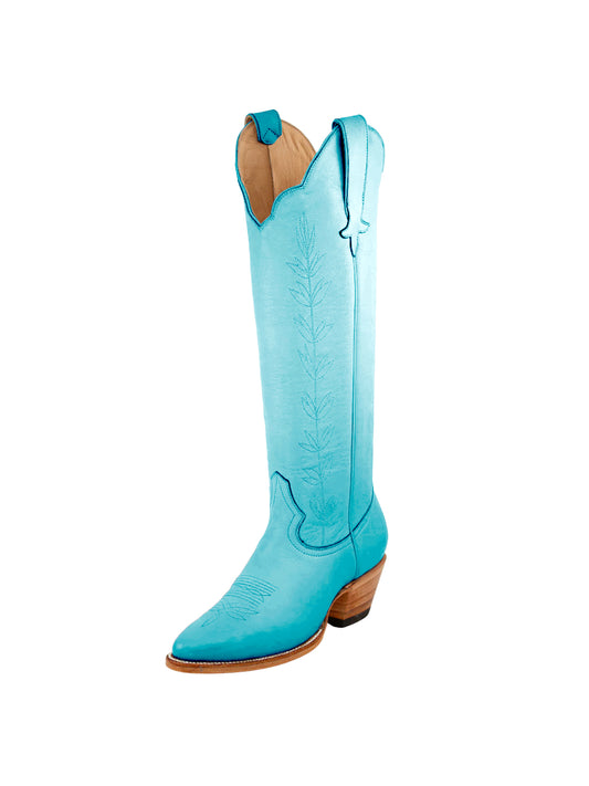 Almond-Toe Leaves Embroidery Wide Calf Knee High Cowgirl Boots - Sky Blue