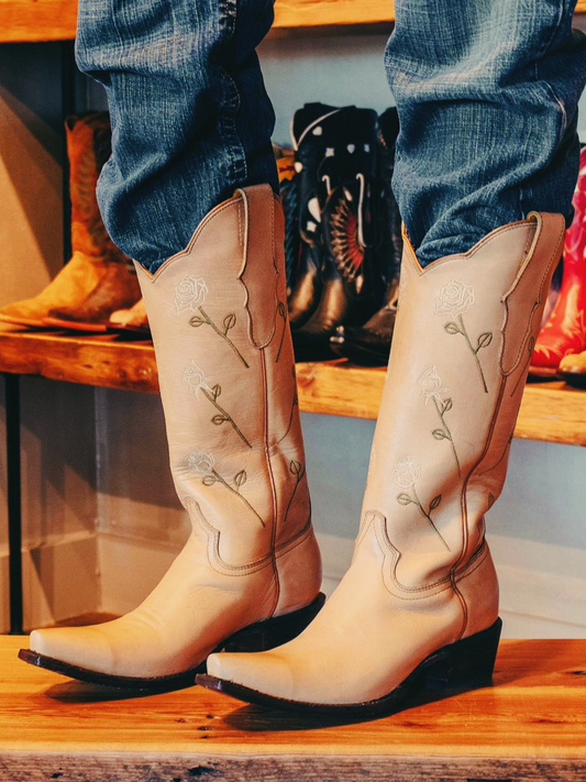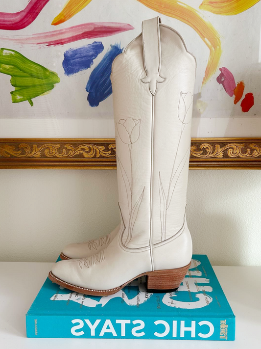 Almond-Toe Tulip Embroidery Wide Calf Knee High Cowgirl Boots - Bone