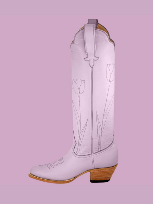 Almond-Toe Tulip Embroidery Wide Calf Knee High Cowgirl Boots - Lavender