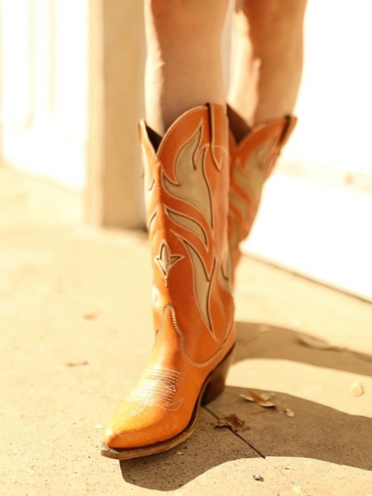 Amber Almond-Toe Shaft Inlay Wide Mid Calf Cowgirl Boots