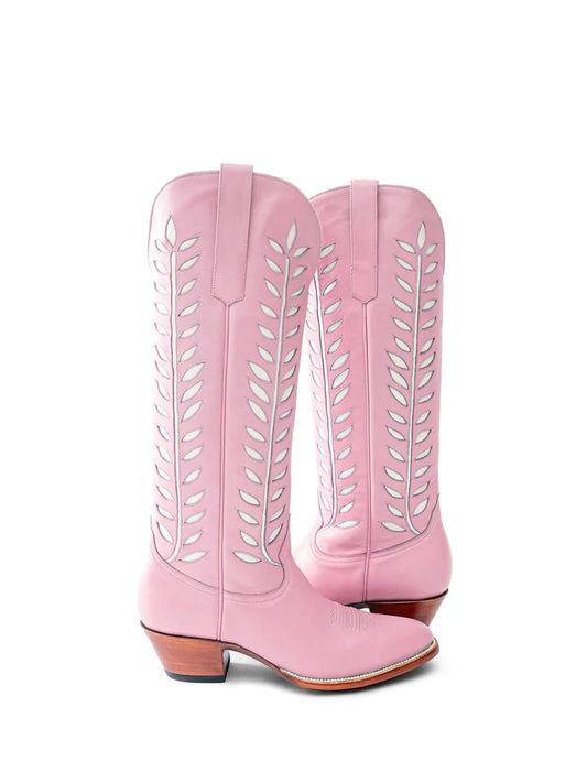 Almond-Toe White Leaves Inlay Wide Calf Tall Knee High Cowgirl Boots - Pink