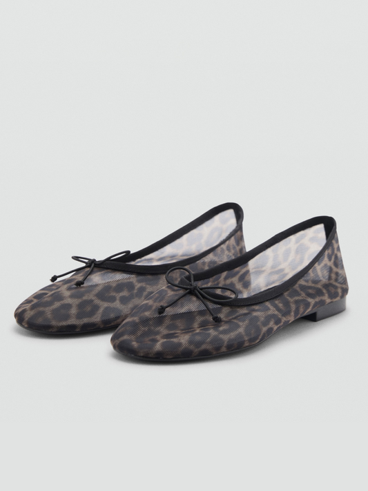 Leopard Mesh Round-Toe Ballet Flats With Bow