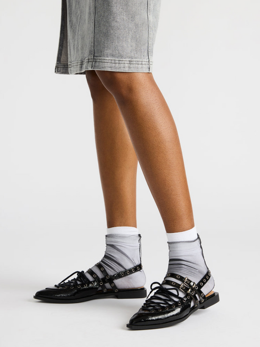Patent Black Pointed-Toe Lace-Up Slingback Double Mid Strap Flats