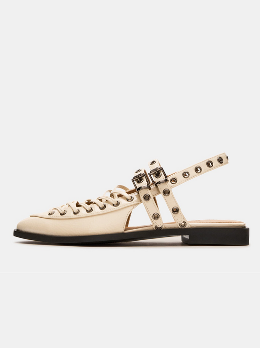 Patent Bone Pointed-Toe Lace-Up Slingback Double Mid Strap Flats