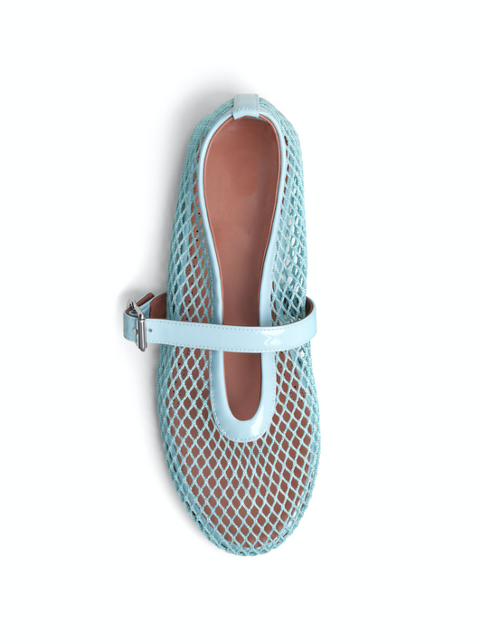 Sky Blue Fishnet Ballet Flats Mary Janes With Buckle Strap