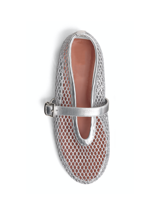 Metallic Silver Fishnet Ballet Flats Mary Janes With Buckle Strap