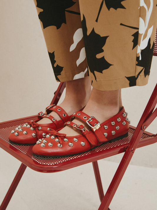 Red Bow Stud Ballet Flats Mary Janes With Grommet Eyelet Buckled Strap